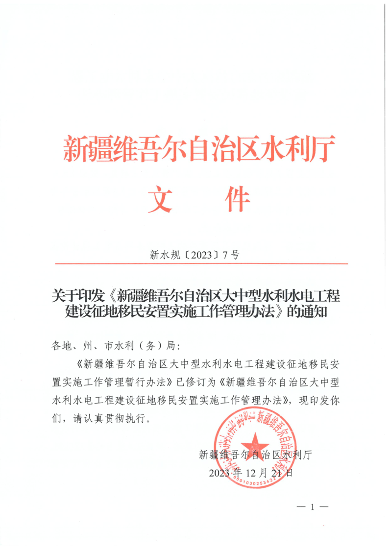 关于印发《新疆维吾尔自治区大中型水利水电工程建设征地移民安置验收实施细则》的通知