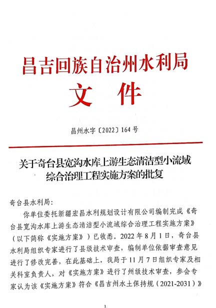 奇台县宽沟水库上游生态清洁型小流域综合治理工程实施方案的批复