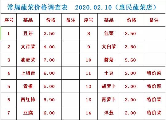奇台县22个政府惠民店2月10日常规蔬菜价格