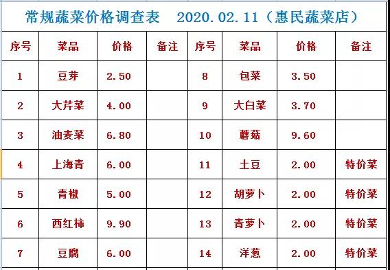 奇台县22个政府惠民店2月12日常规蔬菜价格