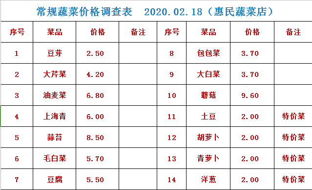 奇台县22个政府惠民店2月18日常规蔬菜价格