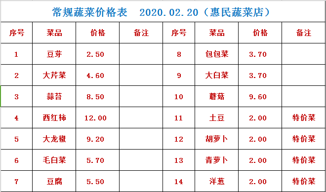 奇台县22个政府惠民店2月20日常规蔬菜价格