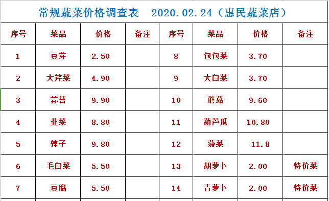 奇台县22个政府惠民店2月24日常规蔬菜价格