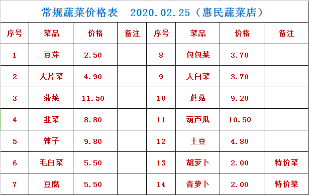 奇台县22个政府惠民店2月25日常规蔬菜价格