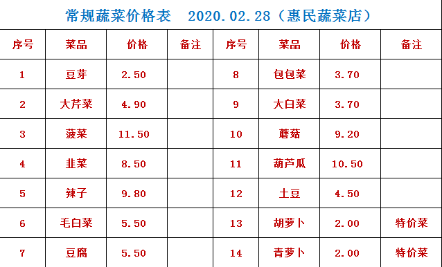 奇台县22个政府惠民店2月28日常规蔬菜价格