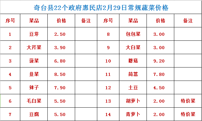 奇台县22个政府惠民店2月29日常规蔬菜价格